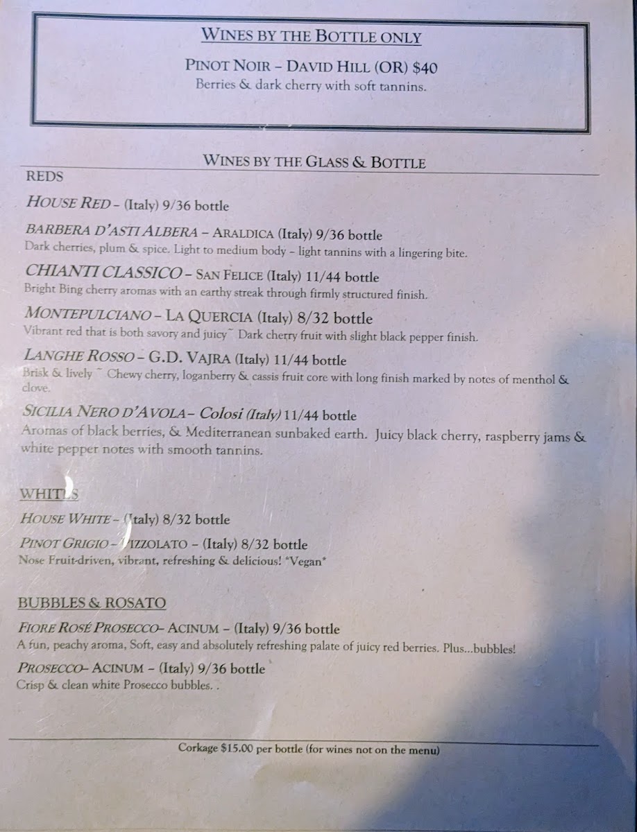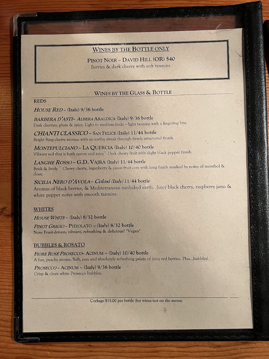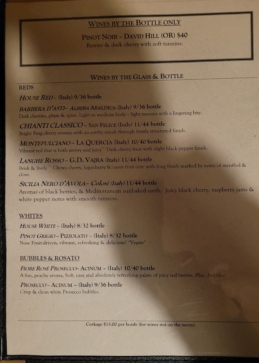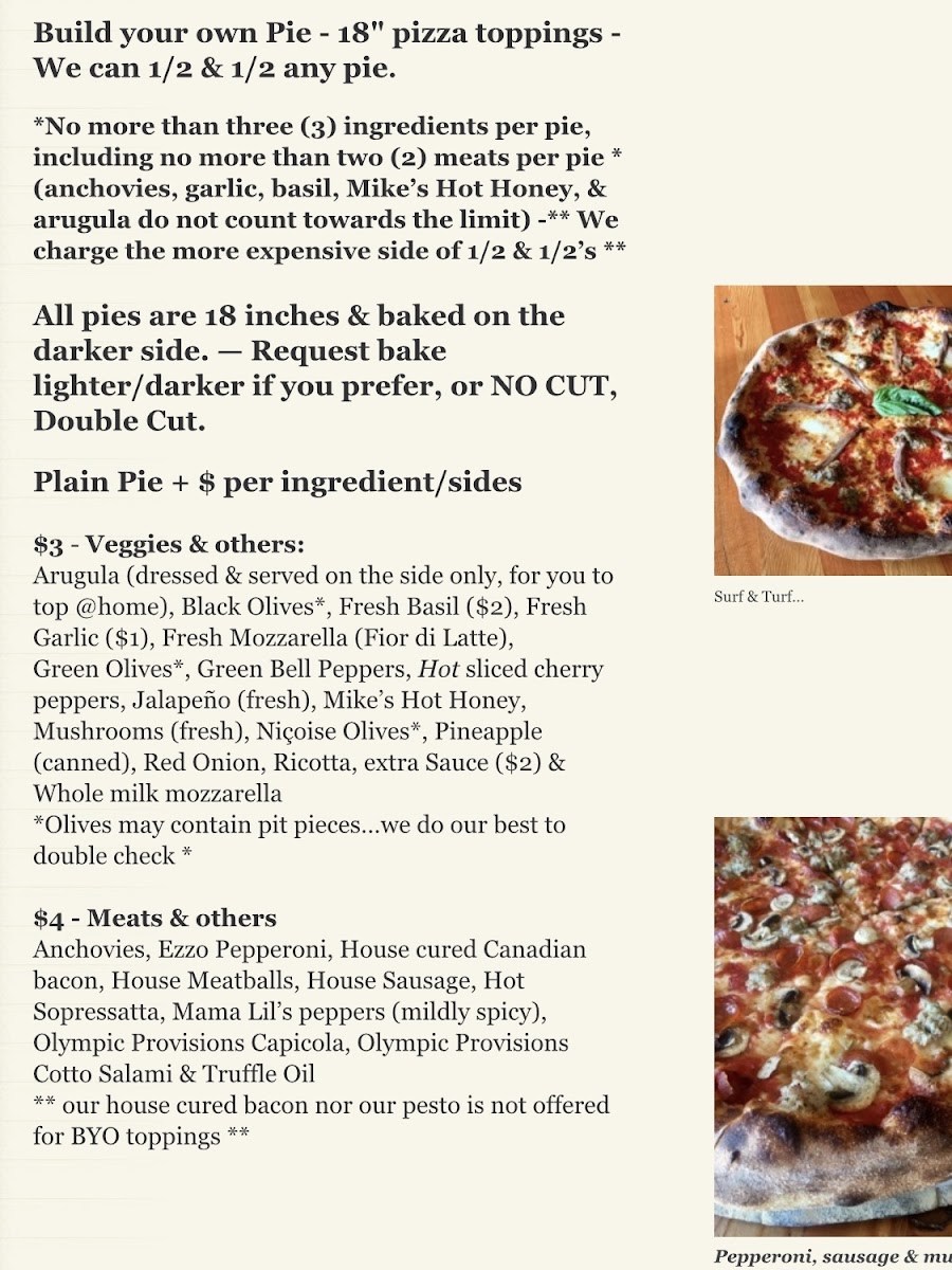 Mozzarella (whole milk & fresh), grana padano, ricotta, lots of fresh garlic, herbs, black pepper, EV olive oil – add sauce for no charge & make it a New York Red.